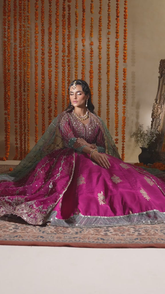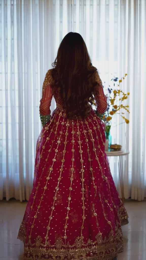 3PC (embroidered organza maxi with hand emblished golden beads, white pearls, sequins, sheesha and batki work paired with block printed Lehnga wth embroidered Border and fully embroidered tilla , thread and sequins work dupatta